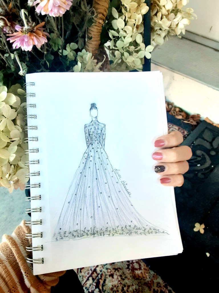 For this design I used a pencil and watercolor. I adore the look of it. I love how everything “flows together”. It reminds me of the ocean {even though this photo was taken in the snow!} My favorite part is the bow in the center of this design. {Just like the last design.} I also love the off the shoulder sleeves.