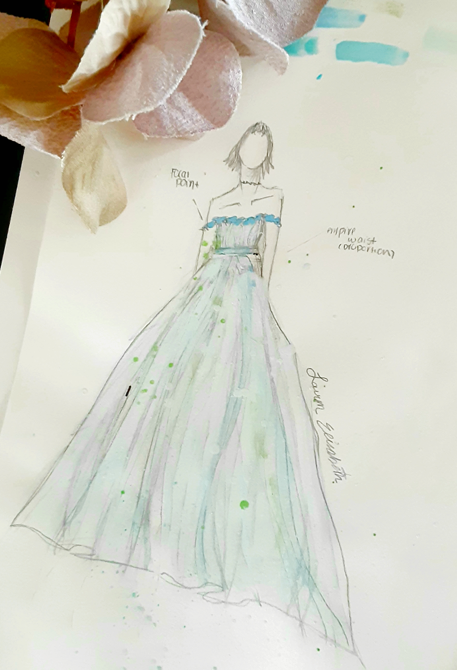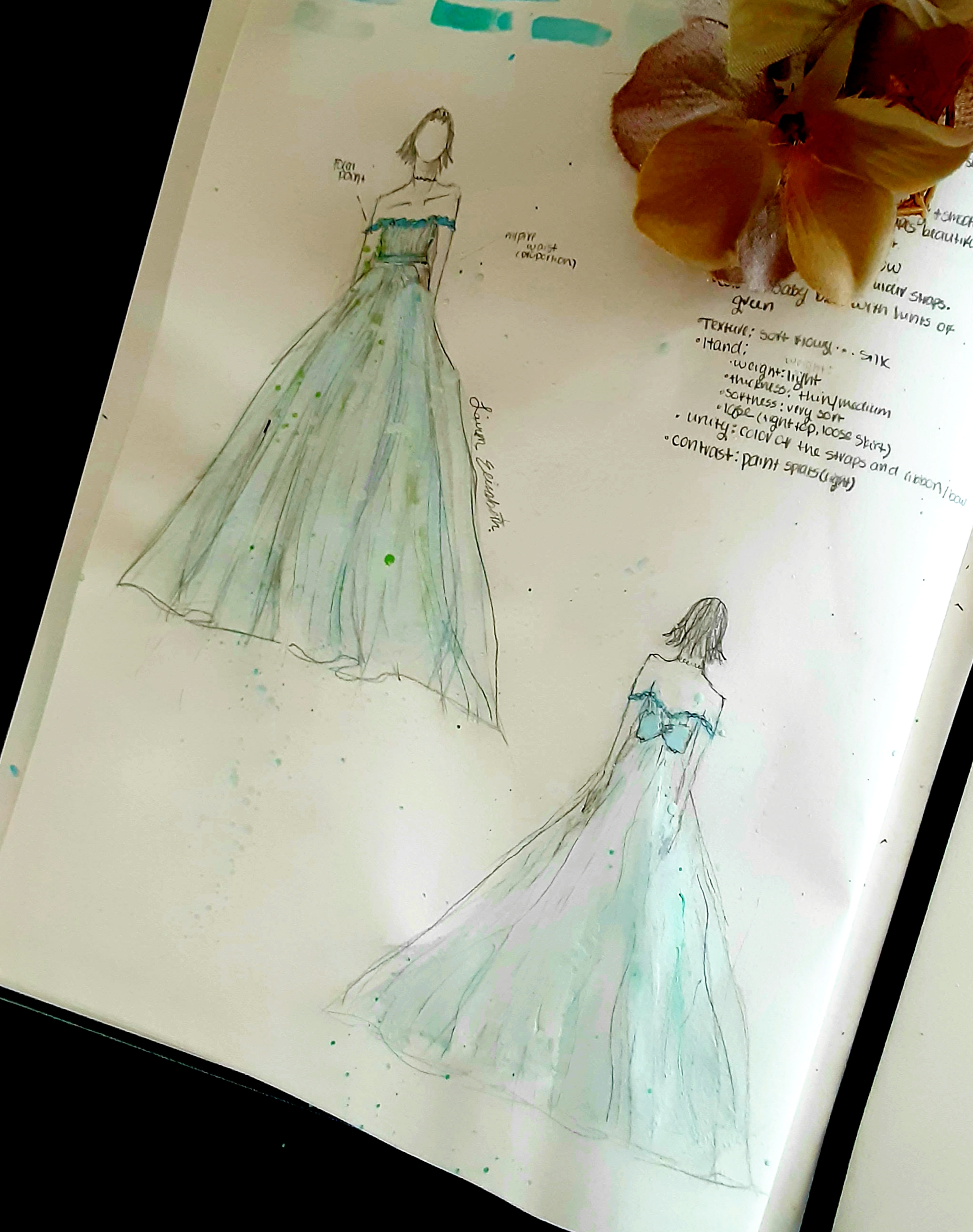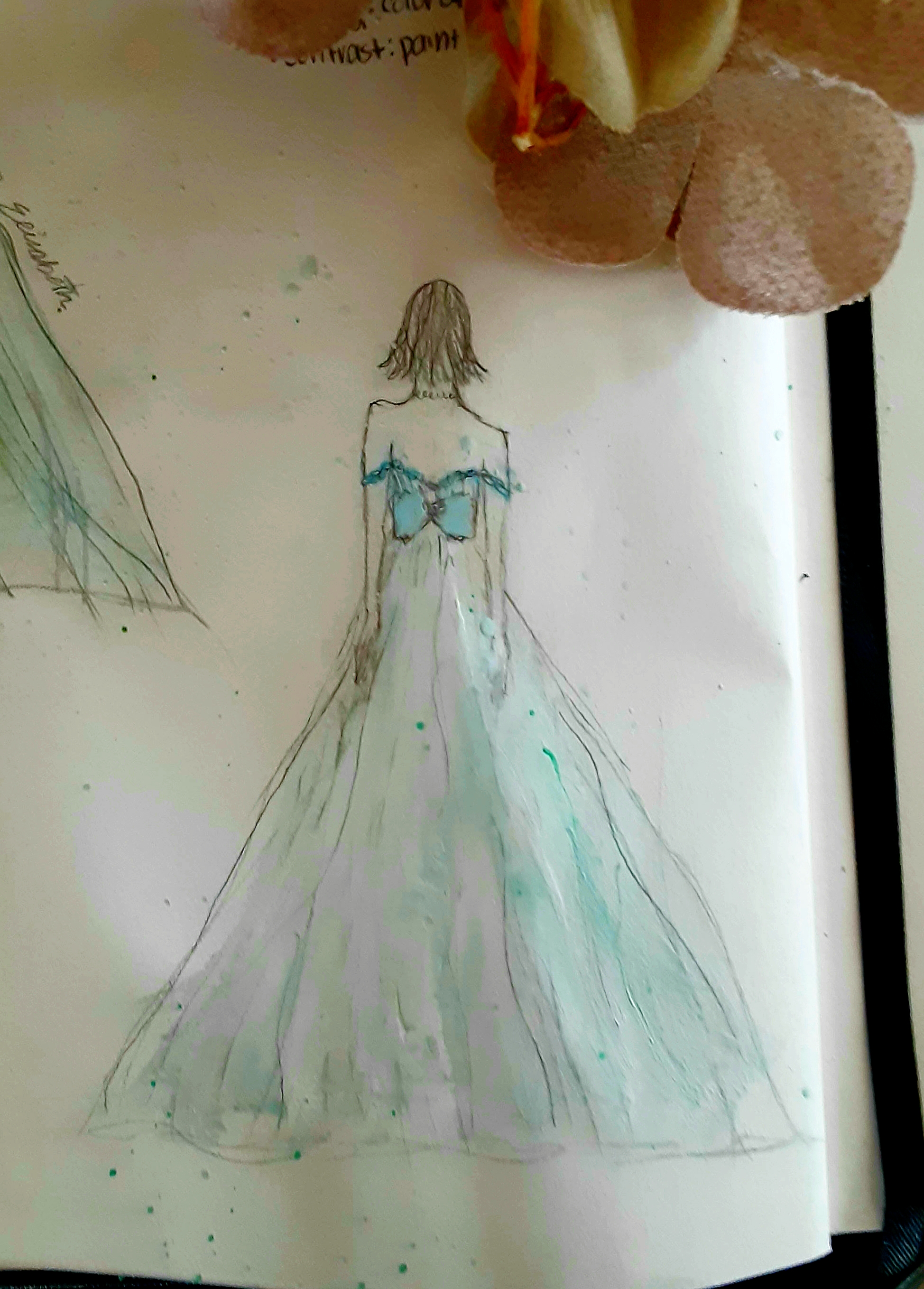 This design was inspired by a dress created by Giorgio Armani. It was part of his 2008 spring/summer collection. I imagine this design to be very flowy and light. I used light blue and added hints of green to paint this design and I absolutely love how it turned out! My favorite parts are the empire waist and off-the-shoulder straps. I also adore the bow in the back!